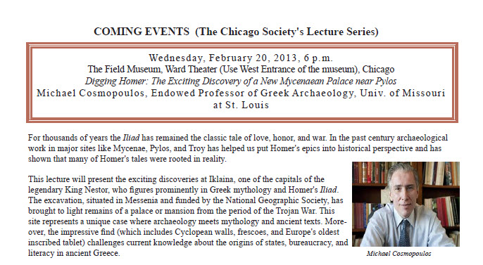 This lecture will present the exciting discoveries at Iklaina, one of the capitals of the legendary King Nestor, who figures prominently in Greek mythology and Homer's Iliad. The excavation, situated in Messenia and funded by the National Geographic Society, has brought to light remains of a palace or mansion from the period of the Trojan War. This site represents a unique case where archaeology meets mythology and ancient texts. Moreover, the impressive find (which includes Cyclopean walls, frescoes, and Europe's oldest inscribed tablet) challenges current knowledge about the origins of states, bureaucracy, and literacy in ancient Greece.