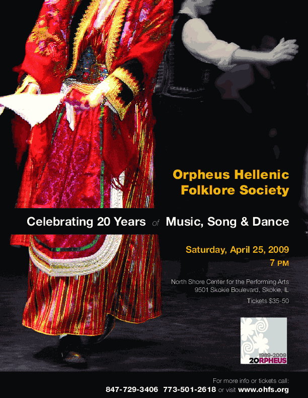 The Orpheus Hellenic Folklore Society of Chicago will proudly celebrate its 20th Year anniversary with a special presentation that will take place at the elegant North Shore Center for the Performing Arts, a state-of-the art theatrical venue. See attached flyer for additional information.